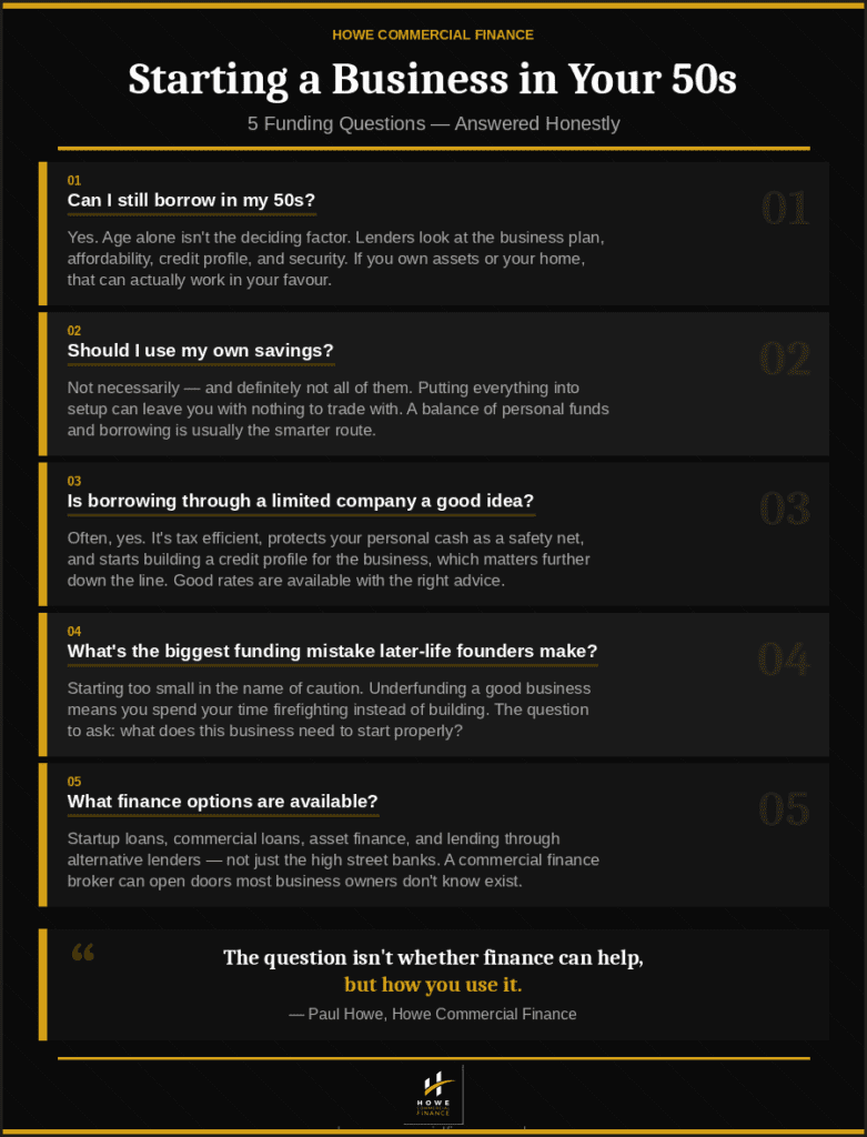 That said, not every business will fit that route, and not every borrower will want it. Some people will be better suited to other forms of finance depending on the sector, the amount needed, the assets involved, and the wider business plan. The British Business Bank’s finance guidance points to a wider range of routes for smaller businesses. This is where working with a commercial finance broker is the best solution. It provides streamlined access to alternative finance options and more comprehensive advice, especially one that has expertise, experience and passion for working with those starting a business later in life.